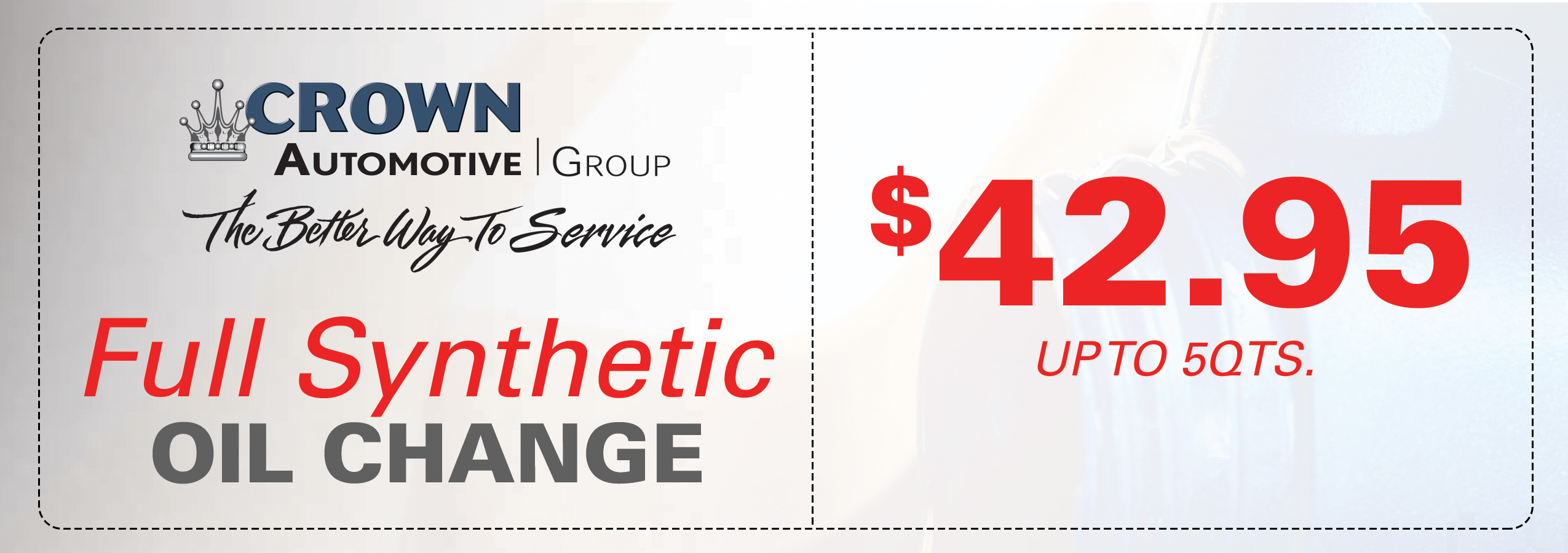 $3.00 additional charge per quart of oil over 5 quarts. Additional charges may apply for specific brand filter requests. Offer applies to passenger cars and light-duty trucks only. Limit one coupon per vehicle. Offer valid only at Crown Acura, Buick GMC, Honda, Hyundai, Kia and Nissan. Must present coupon. Void if copied. No reproductions accepted. Expires on January 31, 2018.