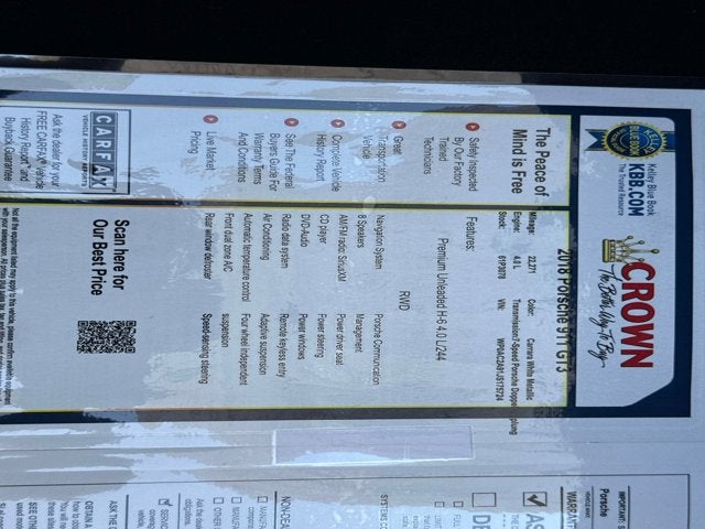 This 2018 Porsche 911 GT3 is finished in Carrara White Metallic over a Black Leather/Alcantara interior and is equipped with a 7-speed PDK transmission. This example carries a clean Carfax and was originally configured with $12,030 in factory options. Known for its high-revving naturally aspirated flat-six and track-focused chassis, the 991.2-generation GT3 remains one of the most engaging modern drivers cars Porsche has produced.