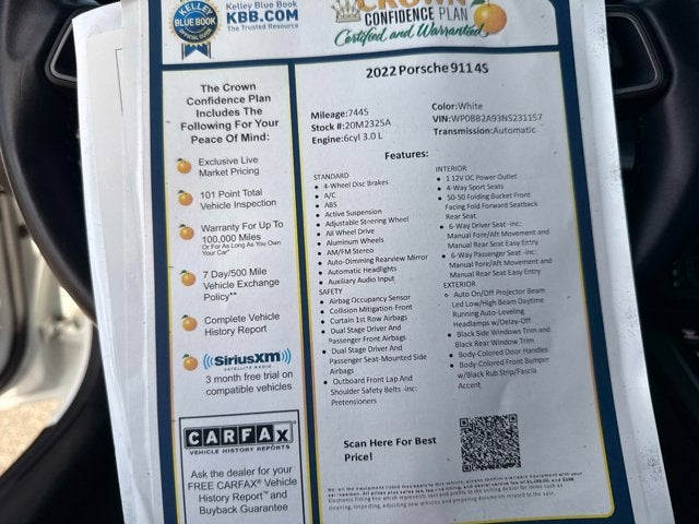 2022 Porsche 911 Targa 4S finished in White over a Black leather interior, showing 7,474 miles and offered with a clean 1-owner Carfax report. This example carries $28,420 in factory options, highlighted by the SportDesign Package in High Gloss Black.